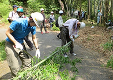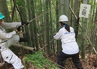 6月22日(土)、京都モデルフォレスト協会の主催で、大山崎町観音寺境内において放置竹林の整備活動が行われました。この活動は、放置竹林の竹を「京の七夕」行事で有効活用し、地域の環境保全を図ることを目的に行われるものです。当行からは6名が参加し、大山崎竹林ボランティアのメンバーの指導を受けながら、のこぎりとロープを使って竹を切り出しました。これらの竹は、京の夏の風物詩となった「京の七夕」の鴨川エリア・堀川エリアで使用される予定です。
