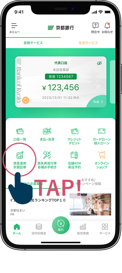 「京銀アプリ」の「資産運用・京銀証券」ボタンもしくは「京銀ダイレクトバンキング」から簡単にお手続きいただけます。